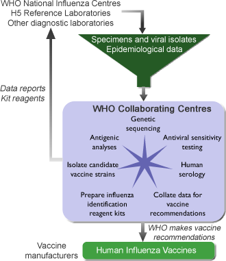 Influenza specimens and isolates obtained at WHO National Influenza Centres and Reference Laboratories are forwarded to a WHO Collaborating Centre, where they are analysed for antigenic (immune response), genetic and anti-viral drug sensitivity properties. Surveillance data about the circulating viruses are continually collected throughout the year and provide information about the predominant influenza viruses currently spreading and circulating in different parts of the world.