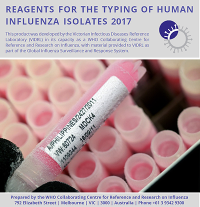 Reagents for typing influenza isolatesThe Melbourne WHO Collaborating Centre provides a kit of influenza reagents so that participating laboratories may conduct their own preliminary identification tests on samples. The kits contain reagents which are appropriate for the identification of isolates obtained from recently circulating viruses of influenza types A(H1N1)pdm09, A(H3N2) and B viruses using the haemagglutination inhibition assay. The B reagents will allow the identification of the two lineages of B viruses the B/Yamagata-lineage and the B/Victoria-lineage. The reagents consist of inactivated egg-grown antigens and antisera prepared in rabbits and are suitable for identification of both egg-grown and cell-grown influenza isolates by the HI (haemagglutination inhibition) test. They will work with turkey red blood cells (RBC), chicken RBC, guinea pig RBC or human RBC. It is recommended that turkey or mammalian RBC are used although chicken RBC can be used successfully if the virus has been passaged in eggs. 2017 Kits Click here for a pdf copy of the HI Typing Assay Kit Information Pamphlet This document is provided as an Adobe Acrobat (.pdf) files. The Adobe Acrobat Reader is available free of charge from Adobe's website.